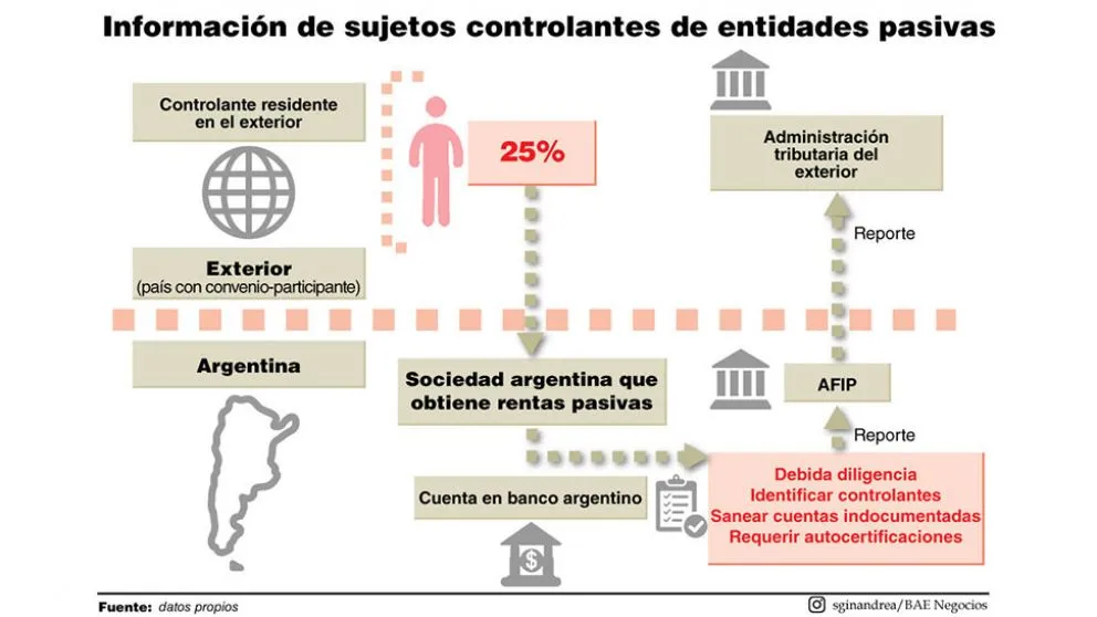 Supongamos, que una sociedad anónima Argentina mantiene una cuenta comitente en una Institución Financiera Argentina y que durante el 2019 obtuvo mayormente rentas pasivas por inversiones en valores. La Institución Financiera debería identificar quiénes son los controlantes de esa sociedad pasiva argentina y obtener las auto-certificaciones y documentación correspondiente para identificar si es un sujeto y cuenta reportable a otra jurisdicción. Si en nuestro ejemplo el controlante es un residente del exterior, entonces la Institución Financiera argentina deberá reportar la cuenta financiera a la AFIP, quien posteriormente remitirá la información a la autoridad de aplicación del exterior.