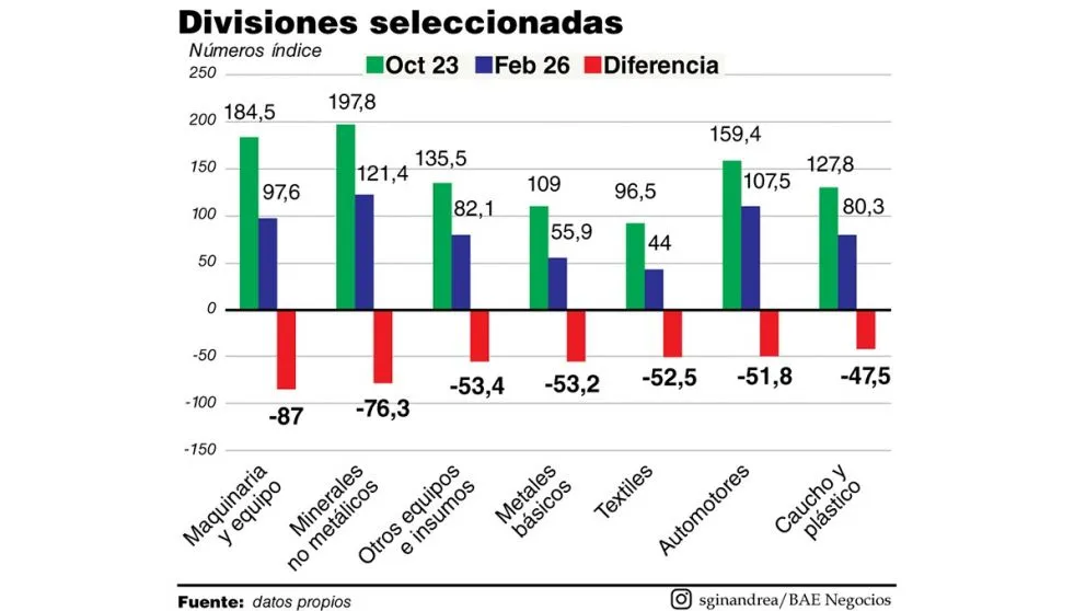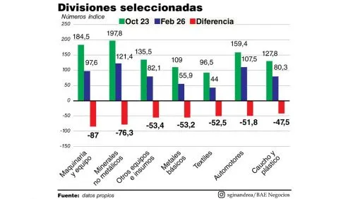 La decadencia del Sector, como se puede observar en la evolución del General o en el desagregado por Divisiones Seleccionadas, desde Octubre'23 a Febrero'26, responde indubitablemente, entre otras, a tres medidas disparatadas: