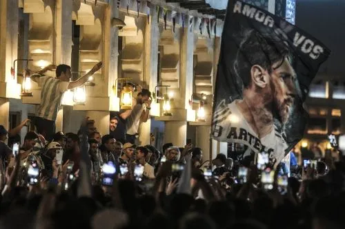 Los hinchas de la Selección argentina expresaron toda su pasión con un colorido y concurrido festejo en el corazón del mercado tradicional de Doha, como previa del partido que el combinado albiceleste disputará hoy ante Países Bajos por los cuartos de final del Mundial. Argentinos y fanáticos de otras nacionalidades se reunieron durante más de dos horas en la intersección de las calles internas del Souq Waqif, en donde se encuentra la escultura del pulgar dorado, una referencia para las expresiones colectivas durante la competencia.