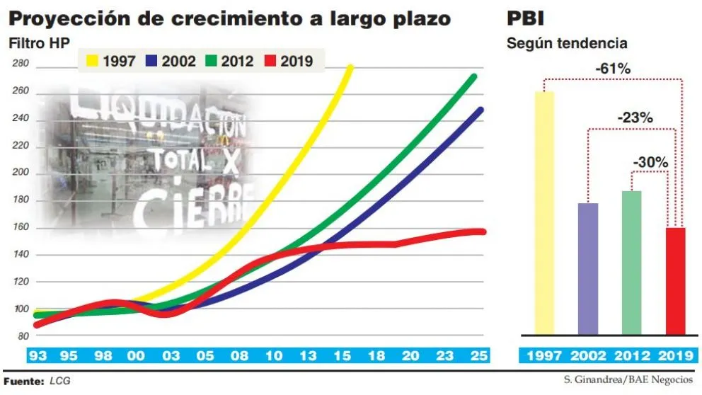 "Ninguna tendencia histórica indicaba que la actividad podía llegar a situarse en estos niveles tan bajos", sentencia el trabajo de LCG. La consultora recuerda que en 1997, la expectativa marcaba que al día de hoy la riqueza producida en el país sería un 61% superior a lo que es actualmente. Crisis de 2001 mediante, en 2002 la tendencia señalaba que al 2019 se llegaría con un producto 23% más grande, hasta llegar a la diferencia de 30% observada desde 2012 en relación al potencial.