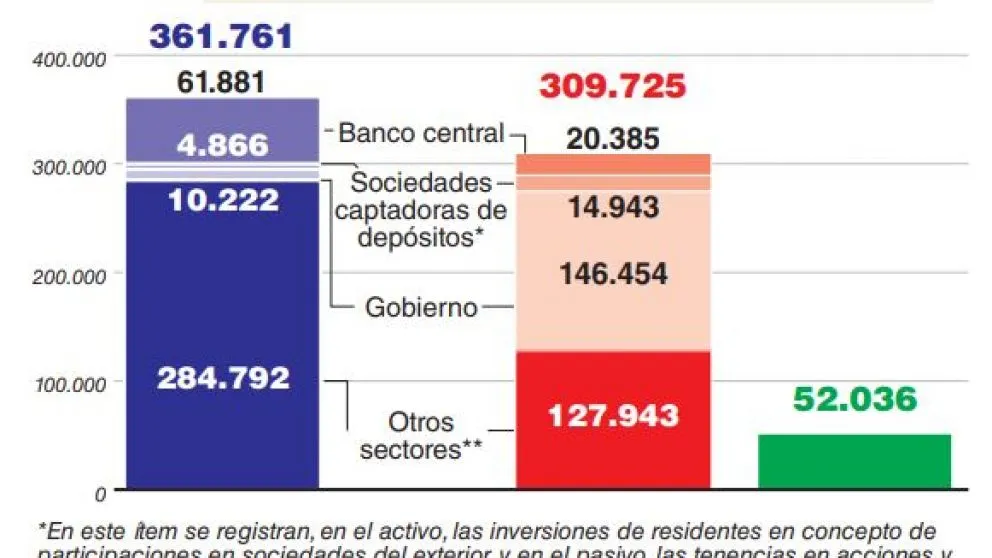 Si bien el estado argentino posee un significativo pasivo en dólares, hay que considerar que, a la inversa, el sector privado conserva un activo en esa misma moneda aún mayor. En tanto y en cuanto la Nación Argentina está conformada por el agregado de ambos sectores, podemos resaltar, como señalan las estadísticas oficiales, que nuestro país mantiene con el mundo una "posición neta positiva".