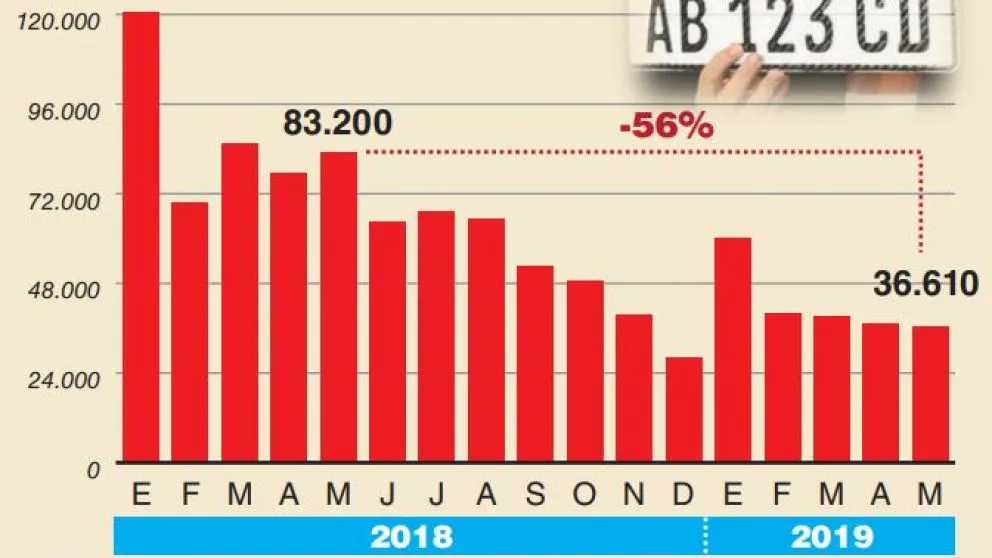 El número de vehículos patentados durante mayo sumó 36.610 unidades, lo que supone una baja interanual del 56%, según informó ayer Acara. El registro del mes pasado supone además un descenso del 1,9% comparado con abril, cuando se patentaron 37.321 unidades, según los datos de la cámara empresaria. El acumulado de los primeros cinco meses del año fue de 213.271 automóviles, un 51,1% menos en relación a los 436.356 del mismo periodo de 2018.