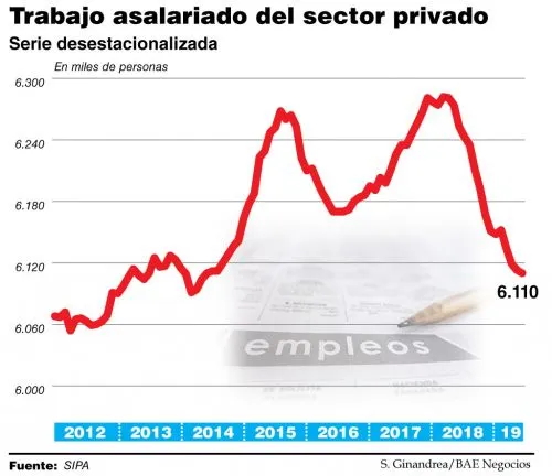 Por caso, en un mes se destruyeron en total 4.000 empleos asalariados, de los cuales 3.000 corresponden al sector privado. De esta forma, el trabajo privado en relación de dependencia se ubicó en julio en el nivel más bajo desde 2012. Si se toma en cuenta que la población crece alrededor de 1% por año, el cuadro se torna aún más preocupante.