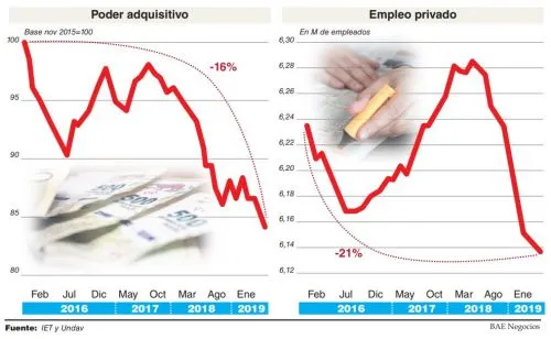 El Instituto Estadístico de los Trabajadores (IET) publicó en su último informe que en términos reales el salario real cayó 16% entre noviembre del 2015 y mayo del 2019. La particularidad que muestran los números recientes es que, contrario a lo que indica la ortodoxia, la pérdida de salario real no redundó en una mejora del empleo sino todo lo contrario.