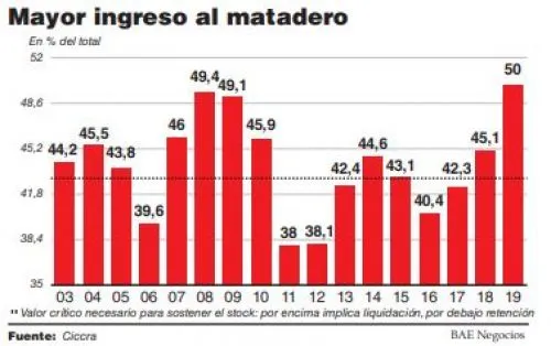 Un informe de la Cámara de la Industria y Comercio de Carnes y Derivados de Argentina (Ciccra), señaló que la participación de las hembras en la faena total volvió a ser superior a 52,3%. Este récord resulta consistente con el elevadísimo costo del dinero que impacta negativamente sobre el negocio del criador, consecuencia de las tasas altas para el financiamiento.