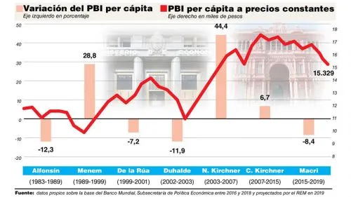 Durante el período 2016-2019, el PBI per cápita totalizará una caída histórica de 8,4%. Eso si se cumple la proyección optimista de variación del producto de 2,6% negativo para el 2019, tal como la proyectaron las consultoras y bancos de la city en el último Relevamiento de Expectativas del Mercado (REM), realizado por el BCRA. La baja del PBI per cápita terminará siendo peor que la del período del ex presidente Fernando De la Rúa, que registró una contracción acumulada de 7,2%.