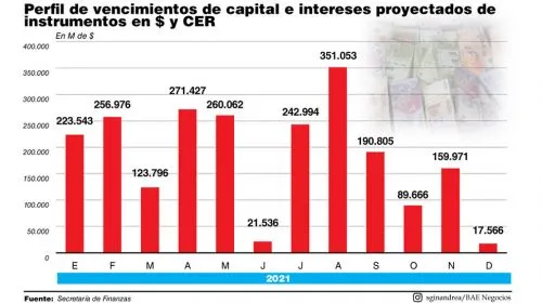El plan oficial para el 2021 es obtener roll over total de la deuda en pesos y financiar alrededor del 40% del déficit primario con colocaciones de Letras. El resto del rojo lo seguirá financiando el BCRA con envíos al Tesoro a través de los Adelantos transitorios y las Transferencias de utilidades. Ese roll over de 140% en enero fue de apenas 114,8%, ya que con vencimientos por $223.543 millones se obtuvieron $33.000 millones extra.