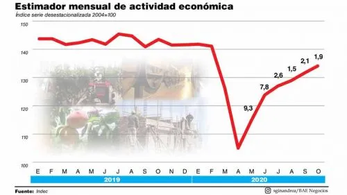 En octubre, la actividad económica no solo logró apilar su sexto mes consecutivo de recuperación, tras el duro golpe que le propinó la Fase 1, sino que lo hizo a un ritmo más elevado que el esperado. La mejora en octubre contra septiembre fue de 1,9%, lo que casi no implicó desaceleración respecto al 2,1% logrado en el mes anterior (corregido por el Indec, ya que había sido de 1,9% también). Octubre era el mes de las dudas, para el que se esperaba un flojo desempeño. Para noviembre la expectativa es que habrá una nueva mejora.