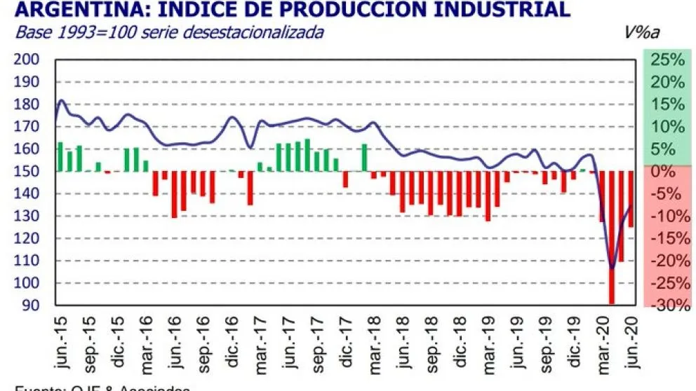 Ferreres agregó que si bien la industria sigue operando muy por debajo de lo ocurrido en febrero (la contracción todavía es de 10,2%, según sus mediciones), ya alcanzó niveles parecidos a los de marzo. Además señaló que la intermitencia de la cuarentena, con sus endurecimientos y relajamientos, le pone incertidumbre a la velocidad con la que ocurrirá la recuperación de los niveles previos.