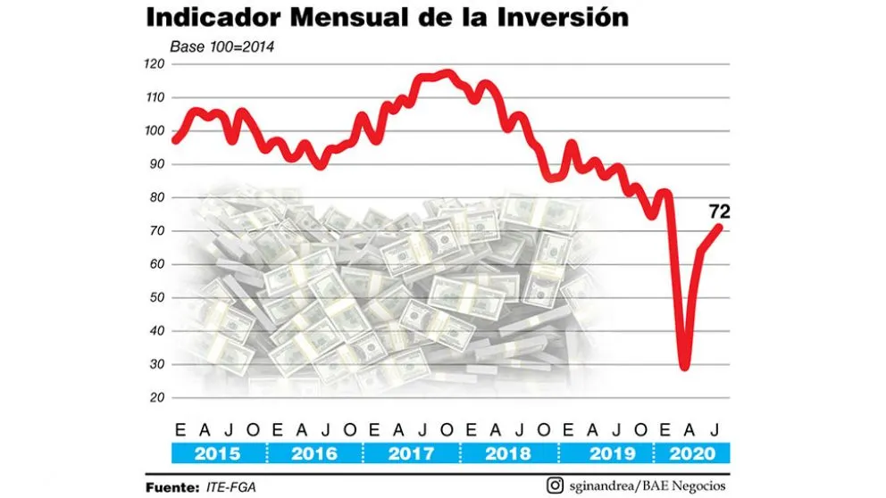 Por eso, respecto a junio hubo una mejora de 8,7%. Pero, puesto en perspectiva, el número cobra otro sentido. Es muy menor al 33,2% del mes anterior. Y sobre todo al 72,5% registrado en mayo. La inversión opera 10,1% por debajo de los niveles de febrero, justo antes del ingreso en la cuarentena en su versión más rígida que, entre marzo y abril llegó a acumular una contracción de 64%. Lo que se dice un rápido rebote con forma de V. Pero la desaceleración de julio muestra que ese ritmo se interrumpirá hacia delante. La V se corta algo antes de llegar a los niveles prepandemia.