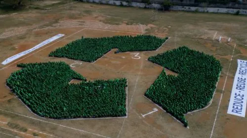 Desde el aire, la imagen era inconfundible: el icónico logo de las tres flechas del reciclaje, formado por miles de personas vestidas de verde. Este evento, organizado en Manila, Filipinas, por una corporación de plásticos, estableció el Récord Guinness para la imagen humana más grande de un símbolo de reciclaje.