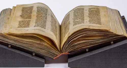 El libro de alrededor del siglo IX con sus 396 hojas de pergamino apiladas de cinco pulgadas de grosor contiene un canon de 24 libros más pequeños, incluido el Antiguo Testamento, y los judíos lo conocen como el Tanakh y, más ampliamente, como la Biblia hebrea.