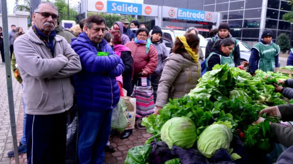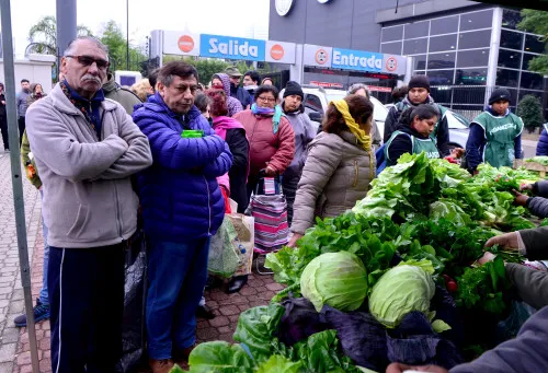 Bajo dos carpas, integrantes de la Unión de Trabajadores de la Tierra (UTT) y de otras organizaciones campesinas repartían 5.000 kilos de verdura de hoja a personas que se acercaban a retirar la mercadería. El Monotributo Social le permite al trabajador de la tierra entrar en la economía formal, emitir facturas por sus ventas, acceder al sistema de salud y realizar aportes jubilatorios, explicaban los militante de UTT.