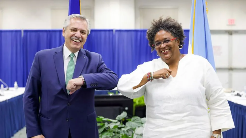 En su última escala internacional previo al regreso al país, Frenández y la primera ministra de Barbados, Mia Mottley ,avanzaron en diferentes líneas de cooperación y asistencia humanitaria, en la lucha contra el calentamiento global y en los procesos de descolonización con eje en la Cuestión Malvinas.