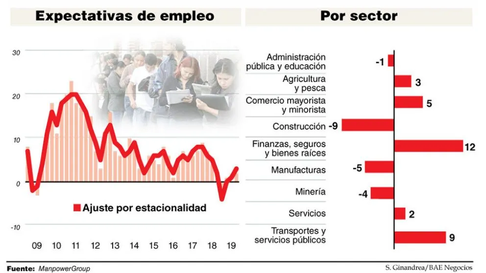 Para el último trimestre del año, bajo notoria influencia del escenario electoral, económico y financiero antes y después de las PASO, se mantiene la negativa percepción de generación de brotes verdes sobre incremento de puestos de trabajo. ManpowerGroup (MPG) presentó su Encuesta de Expectativas de Empleo para los 90 días que cerrarán 2019 y allí los resultados definieron que la Expectativa Neta de Empleo (ENE) mejoró 2 puntos en comparación con el trimestre anterior y 1% interanual. Como acontece, desde que las denominadas "tormentas económicas" -al decir del presidente Mauricio Macri- azotaron al país, la relación entre expectativas y los registros oficiales sobre empleo registrados guardan delicada simetría.