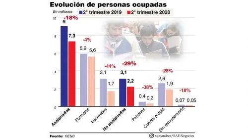 En repaso a algunos números del informe, respecto a cuentapropistas, dicho universo para el segundo trimestre de 2019 era de 2.600.000 personas y en el mismo tramo de 2020 reveló 1.900.000. La variación absoluta de la baja se cifró en 742.000 trabajadores por cuenta propia en un porcentaje negativo del 28%.