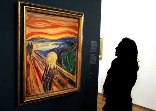 Después de La Gioconda de Leonardo Da Vinci, el de "El grito" es el personaje más emblemático del arte occidental. Bajo un cielo en llamas, amarillo, naranja y rojo, una figura andrógina paralizada sobre un puente, la cabeza en forma de calavera, las manos sobre las mejillas demacradas cubriéndose los oídos, vive un momento de horror abrumador. A sus espaldas, otras dos figuras caminan indiferentes hacia un lago. En una litografía en blanco y negro, el propio Munch dejó una clarificadora inscripción que no aparecen en sus versiones en color: “Sentí un gran grito en toda la naturaleza”.